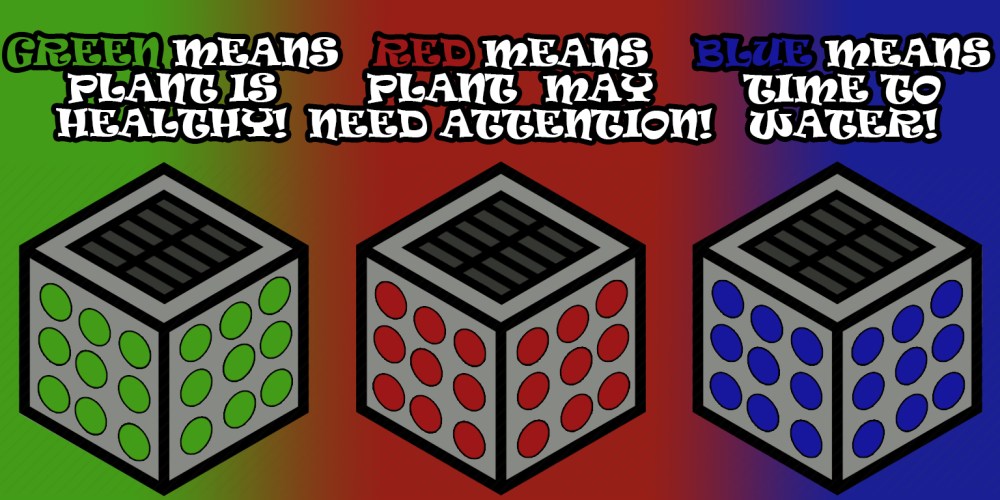 The image above shows the three main states that the Green-O-Meter will reflect for users. When our cube displays a green color it means that your plant is healthy. When it displays a red color it means that it is in need of more attention than just watering (too much sun exposure, etc.). When it displays a blue color it means that your plant is in need of watering but is otherwise doing well.