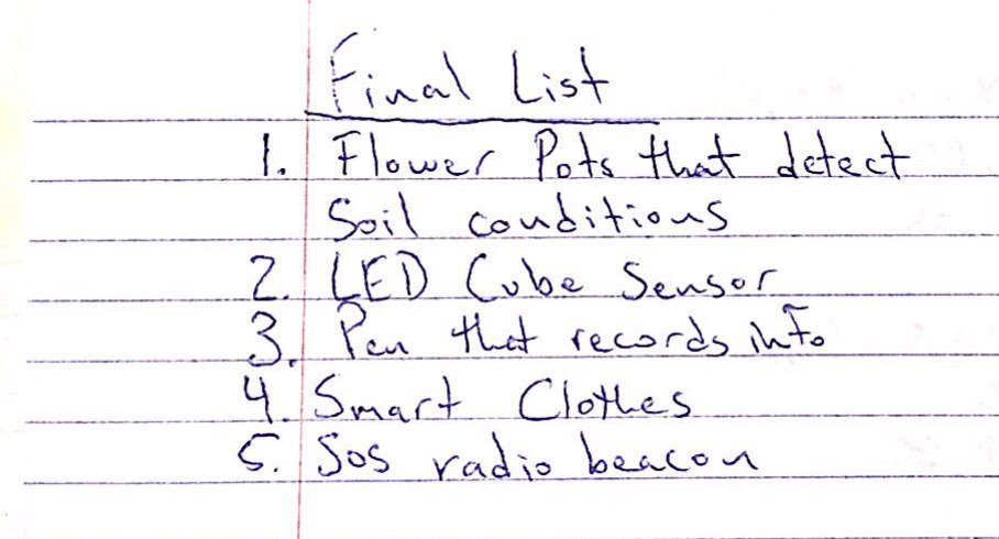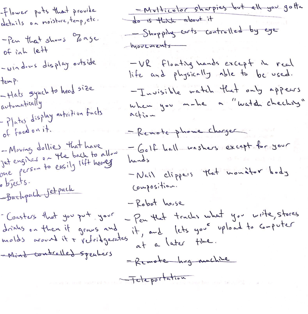 Now that we have gone a little more in depth about how the Green-O-Meter works, we would like to take a moment to explain how we decided on this idea and the period of ideation that we took in order to mull over other ideas that we had. Before we began thinking about any ideas in depth, we had to come up with them. Each group member took about 20 minutes to write down every UbiComp technology idea that they could think of on a piece of paper. We have included a couple of those lists below.