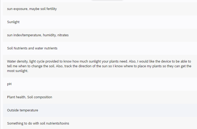 The figure above shows the most common words in response to our question, “If this device was able to track other properties of a plants environment, what additional indicators, if any, would you like to see included (other than soil moisture)?”.